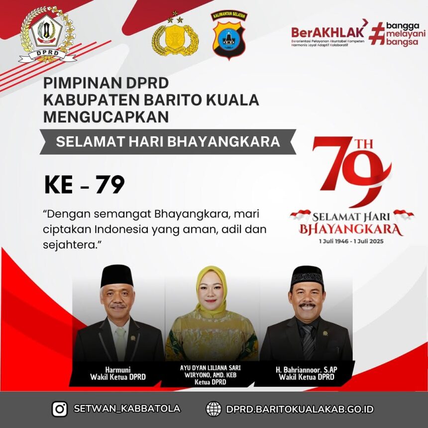 KANALKALIMANTAN.COM, MARABAHAN- Ketua DPRD Kabupaten Barito Kuala (Batola), Ayu Dyan Liliana Sari Wiryono, Amd. Keb., menyampaikan ucapan selamat Hari Bhayangkara ke-79 kepada seluruh jajaran Kepolisian Republik Indonesia, khususnya yang bertugas di wilayah Batola.