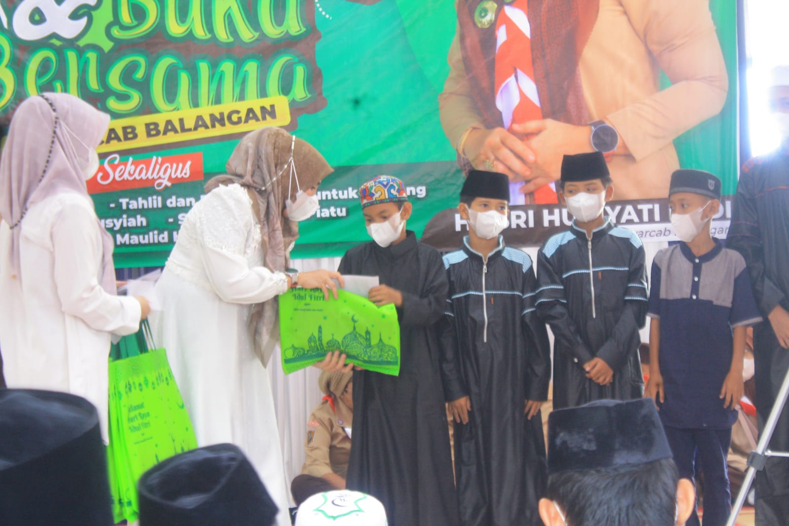 Ketua Kwartir Cabang Gerakan Pramuka (Kwarcab) Kabupaten Balangan Hj Sri Huriyati Hadi memberikan santunan kepada anak-anak yatim piatu. Foto: alfi