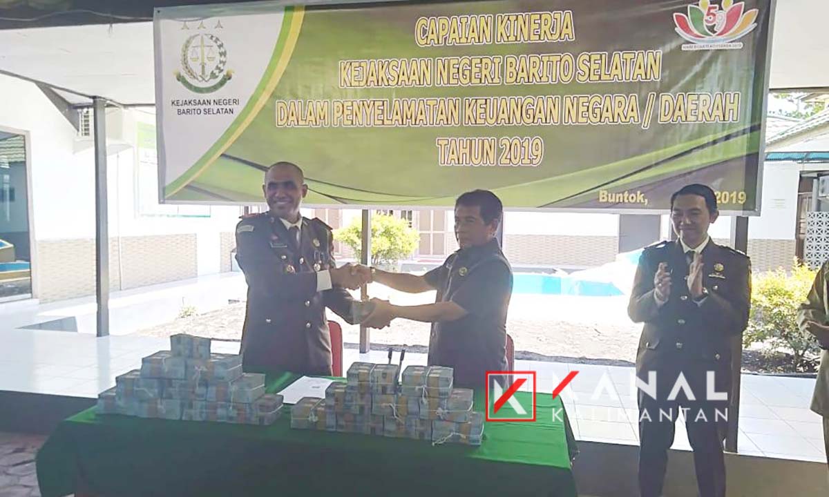 BUNTOK, Kinerja capaian Kejari Barsel di tahun 2019 berhasil menyelamatkan keungaan negara hampir Rp 1 miliar dari tindakan hasil korupsi. Barang bukti uang tunai itu diserahkan kepada Pemkab Barsel di kantor Kejari Barsel, Senin (22/7).