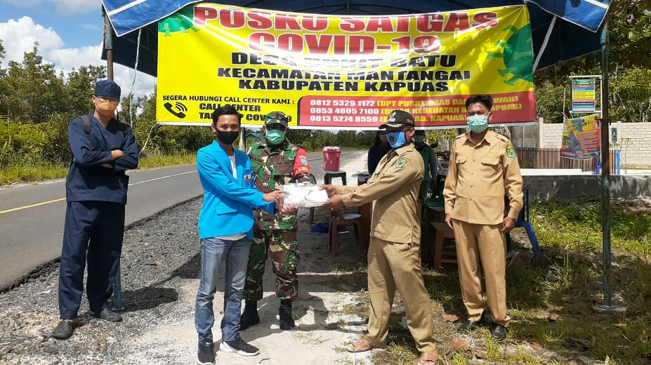 KANALKALIMANTAN. COM, KUALA KAPUAS – Komite Nasional Pemuda Indonesia Kabupaten Kapuas (KNPI Kapuas) menyalurkan bantuan masker ke Posko Satgas Covid-19 Desa Bukit Batu, Kecamatan Mantangai, Kabupaten Kapuas, Selasa (28/4/2020). Bantuan masker yang diserahkan Ketua KNPI Kapuas Irfan tersebut diterima Kepala Desa Batu Edi Susanto.