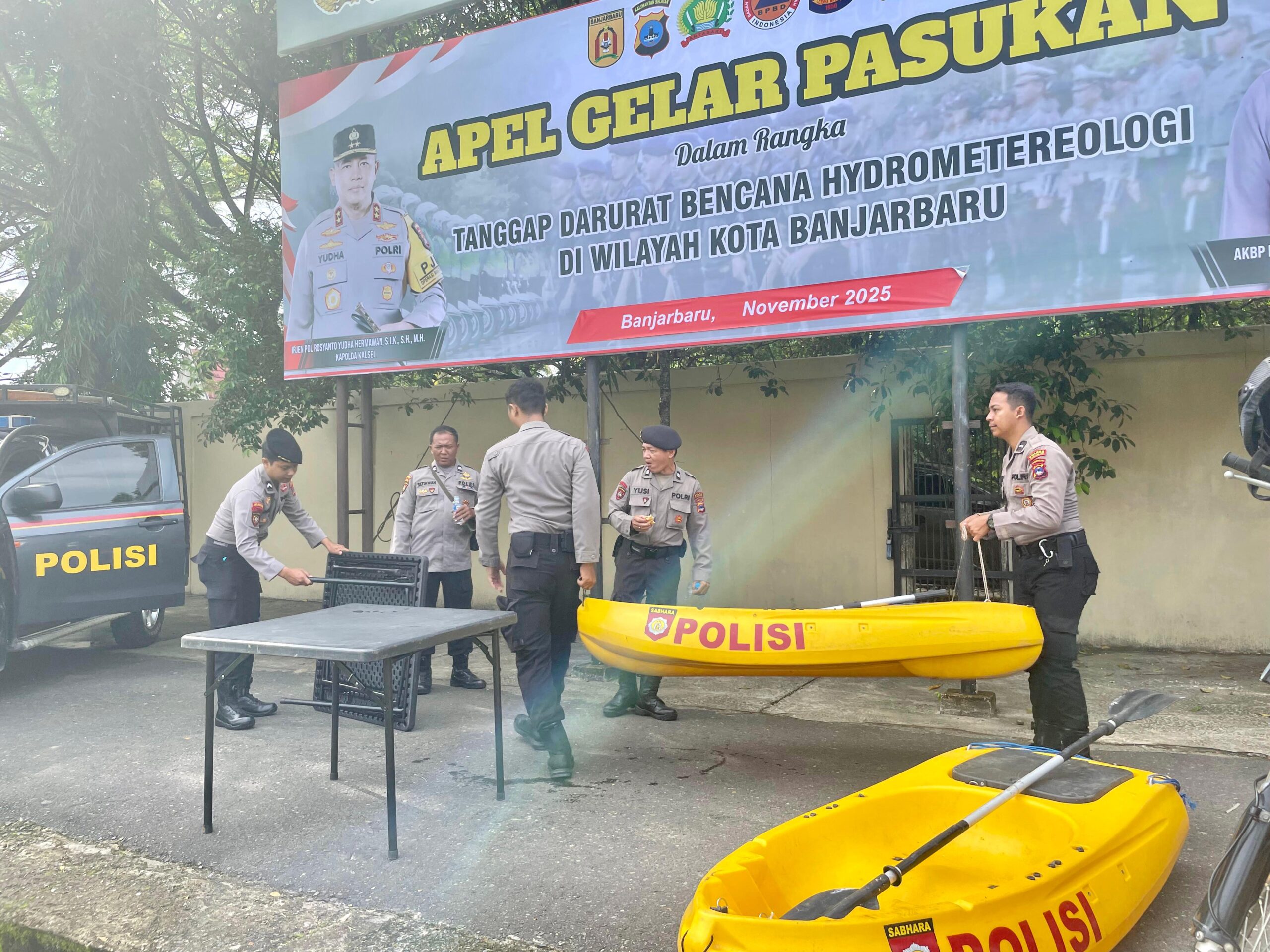 Demi kesiapsiagaan bencana hidrometeorologi seperti cuaca ekstrem, banjir, dan angin puting beliung digelar apel gabungan di lapangan hijau Mapolres Banjarbaru, Rabu (5/11/2025).
