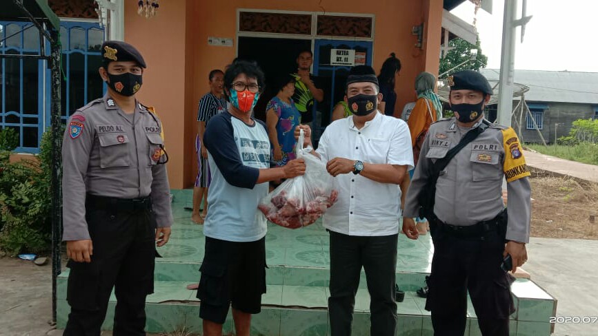 Kapolsek Kapuas Murung Iptu Jimin didampingi anggota Polsek Kapuas Murung, menyampaikan penyaluran bantuan 50 paket daging kurban kepada Ketua RT 11 Gunawan, perwakilan warga musibah kebakaran.