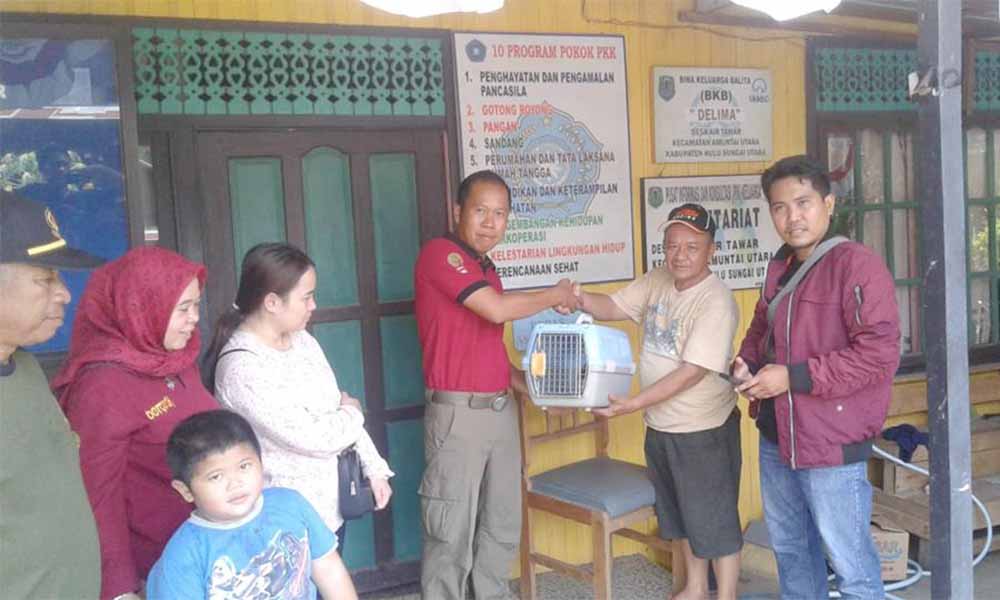 Minggu (24/3) sekitar pukul 11.30 bertempat dikantor Desa Air Tawar dilakukan penyerahan binatang yang dilindungi tersebut kepada KPH Balangan yang disaksikan oleh petugas dari BKSDA drh. Dinas Kartika Riani beserta warga.