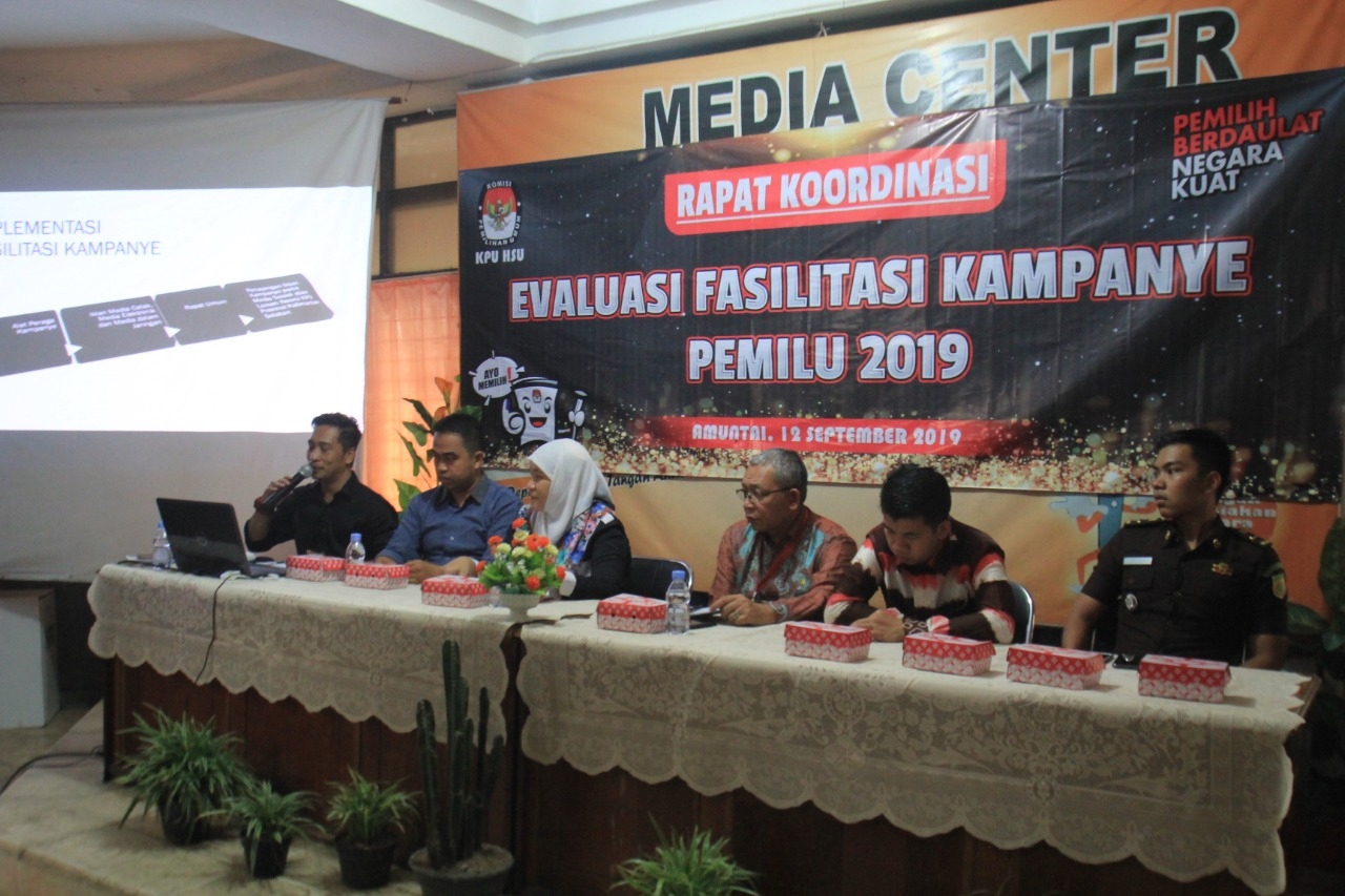 Dikatakan Ketua KPU HSU Mei Saputri dalam sambutannya, adapun tujuan digelarnya evaluasi tidak lain menindaklajuti surat KPU RI Nomor: 1000/PL.01.6-SD/KPU/VII/2019 tentang kegiatan evaluasi fasilitas kampanye pemilu 2019. Kemudian untuk mengetahui kelemahan – kelemahan terhadap proses tahapan kampanye yang sudah dilakukan dengan baik selama ini.