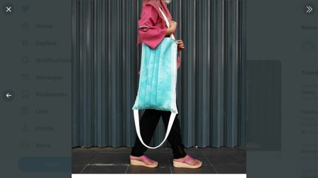 Dibagikan oleh akun Twitter @kerumunan pada 13 Mei, pemilik akun mengunggah foto tangkapan layar yang memperlihatkan seorang perempuan mengenakan tas berbentuk masker tersebut.