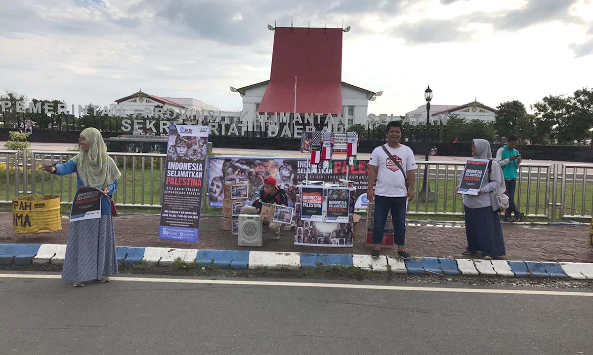 BANJARBARU, Indonesia selamatkan Palestina. Begitulah tulisan yang terpampang di spanduk yang dibentangkan oleh tim Masyarakat Relawan Indonesia (MRI) Banjarbaru di depan kantor Gubernur Kalsel, Minggu (17/2) pagi. Selain spanduk, juga terdapat banner dan poster dengan tema yang sama. Relawan lainnya terlihat sibuk melayani pengunjung booth yang menjual merchandise Palestina.