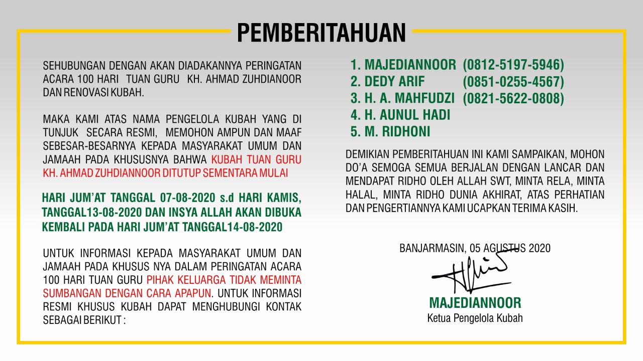 Sehubungan dengan pandemi Covid-19 yang masih melanda, pihak pengelola kubah Abah Guru Zuhdi mengadakan acara peringatan 100 hari wafat Al’alimul Allamah KH Ahmad Zuhdianoor secara terbatas atau hanya khusus untuk undangan. Acara 100 hari wafat Abah Guru Zuhdi akan digelar pada Sabtu 8 Agustus 2020, setelah Sholat Isya, di area kubah.
