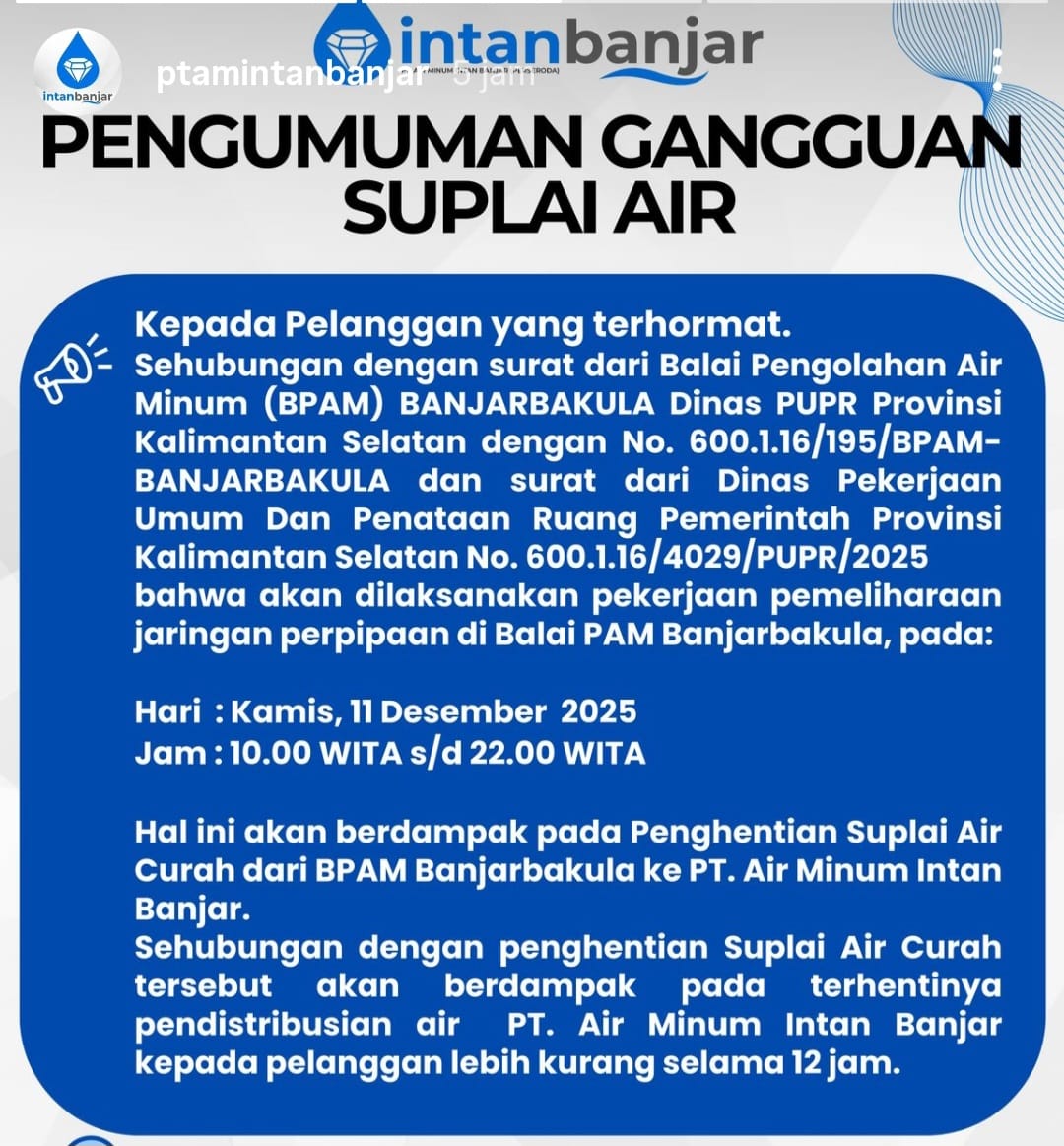 KANALKALIMANTAN.COM, BANJARBARU - Manajemen PT Air Minum (PTAM) Intan Banjar melalui akun resminya mengumumkan adanya gangguan distribusi air bersih kepada… Read More