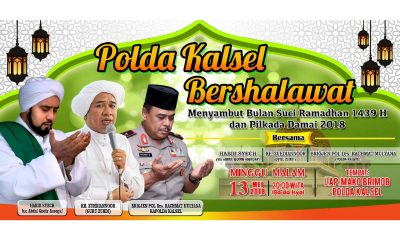 BANJARBARU, Polda Kalsel Bershalawat  dalam rangka menyambut bulan suci Ramadhan 1439 H dan Pilkada Damai 2018 akan disenggalarakan Minggu (13/5) pukul 20.00 Wita, di lapangan Mako...