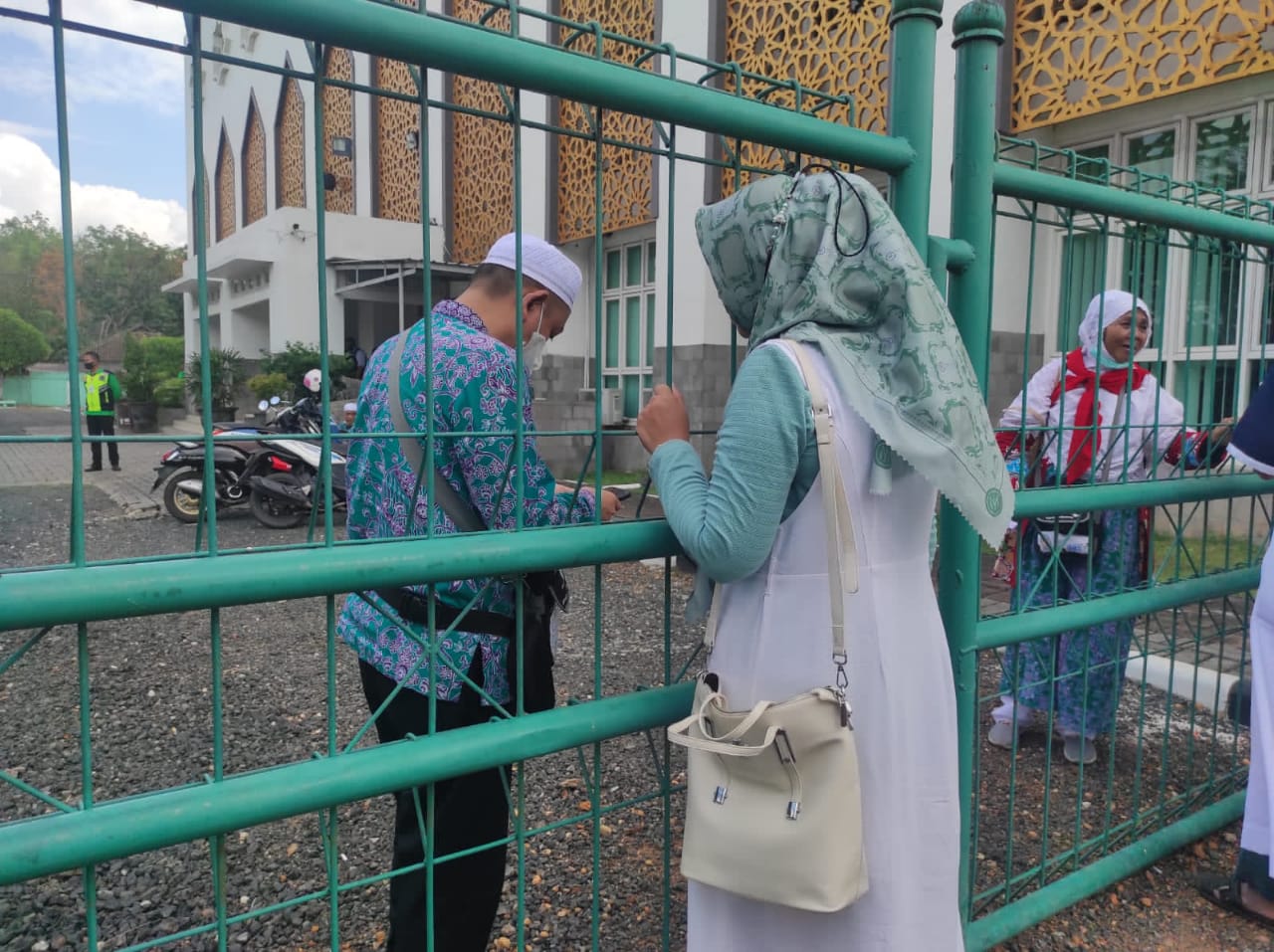 Ada beberapa keluarga yang hanya bisa menyaksikan lewat pagar Asrama Haji hal ini berdasarkan peraturan yang diberlakukan seiring naiknya kasus Covid-19 di Banjarbaru.
