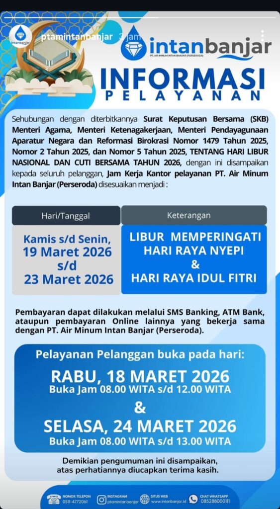 Berdasar pengumuman yang dipasang manajemen PTAM Intan Banjar pada akun resmi mereka disebutkan, pelayanan kantor dinyatakan libur sejak Kamis (19/3/2026) hingga Senin (23/3/2026) berkaitan dalam rangka peringatan Hari Raya Nyepi dan Hari Raya Idulfitri.