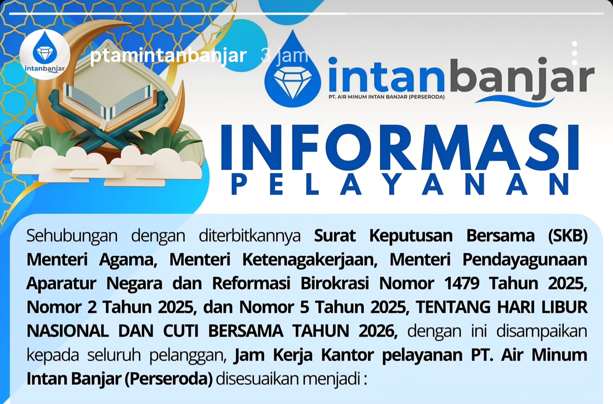 KANALKALIMANTAN.COM, BANJARBARU – Terbitnya Surat Keputusan Bersama (SKB) Menteri Agama, Menteri Ketenagakerjaan, serta Menteri Pendayagunaan Aparatur Negara dan Reformasi Birokrasi tentang Hari Libur Nasional dan Cuti Bersama Tahun 2026 membuat PT Air Minum (PTAM) Intan Banjar (Perseroda) menyesuaikan jadwal pelayanan kepada pelanggan dalam rangka libur nasional dan cuti bersama Tahun 2026.