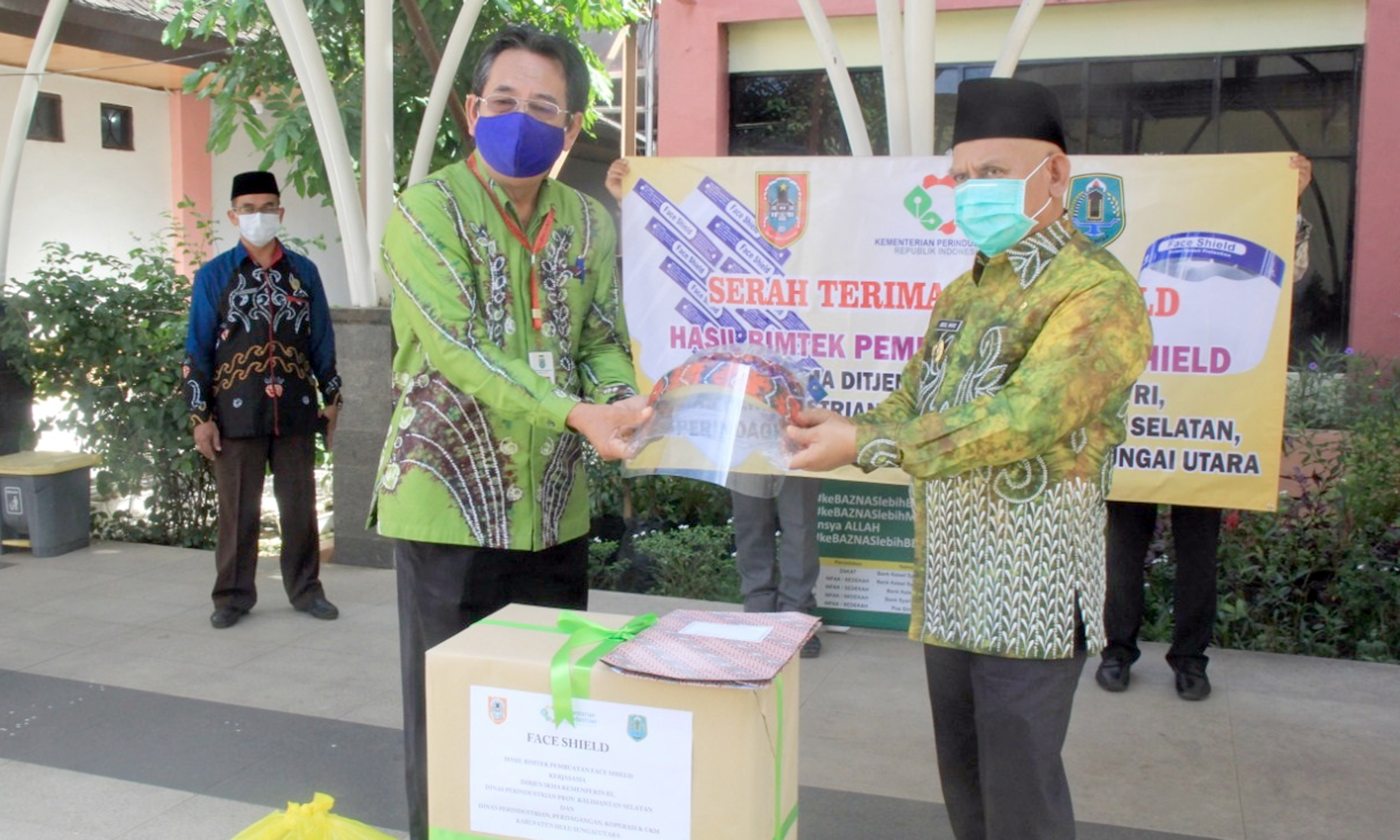 Bantuan face shield diserahkan langsung Kepala Disperindagkop HSU H Akhmad Redani Effendi di halaman rumah Dinas Bupati HSU, Kamis (1/9/2020) disambut langsung Bupati HSU H Abdul Wahid HK.