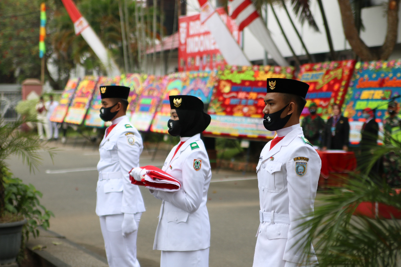 Upacara pengibaran bendera merah putih HUT ke-75 Kemerdekaan RI di halaman kantor Bupati Banjar, Senin (17/8/2020). foto: wahyu