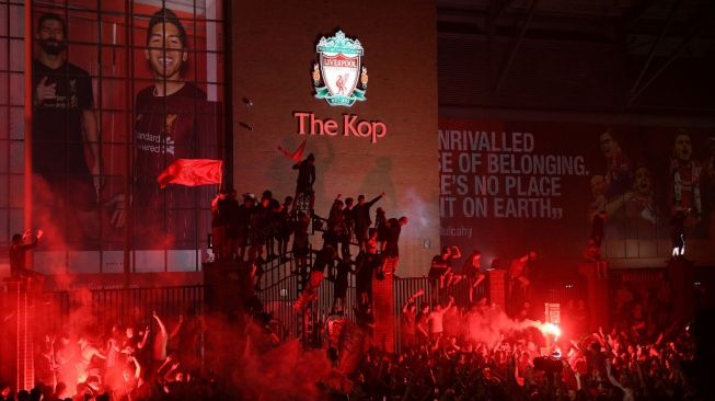 Di tengah pandemi COVID-19, sekelompok fans Liverpool melakukan perayaan di luar Stadion Anfield, Liverpool, Jumat (26/6/2020) dini hari WIB. Liverpool dipastikan menjuarai Liga Inggris 2019/2020 usai kekalahan 1-2 Manchester City di markas Chelsea. Foto: OLI SCARFF/AFP