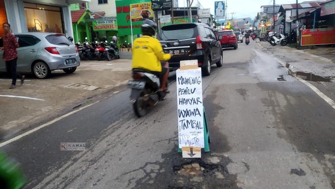 KANALKALIMANTAN.COM, BANJARMASIN – Merasa kesal dengan kondisi jalan rusak berlubang di tengah jalan, warga Cemara Raya, Banjarmasin, pasang rambu peringatan sekaligus sindirin nyelekit.