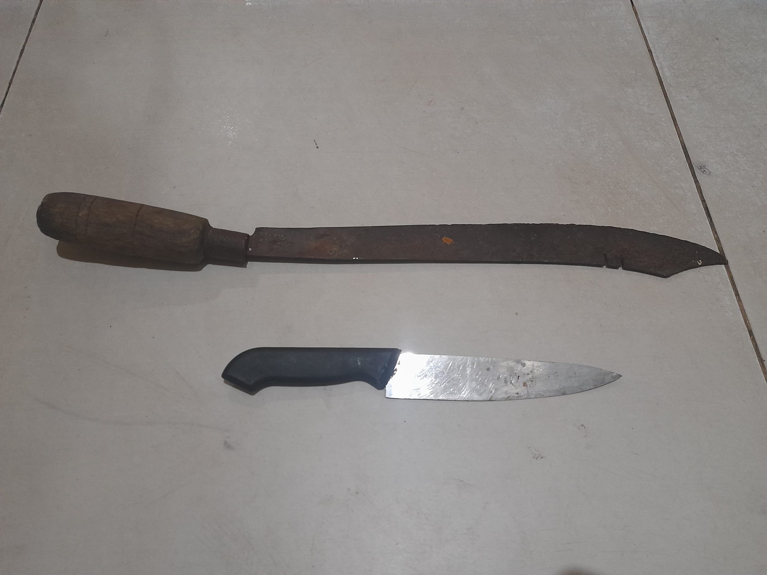 Tersangka MI dan barang bukti berupa senjata tajam jenis parang dan pisau dapur yang digunakan dalam tindakan kekerasan terhadap AG berhasil ditemukan.