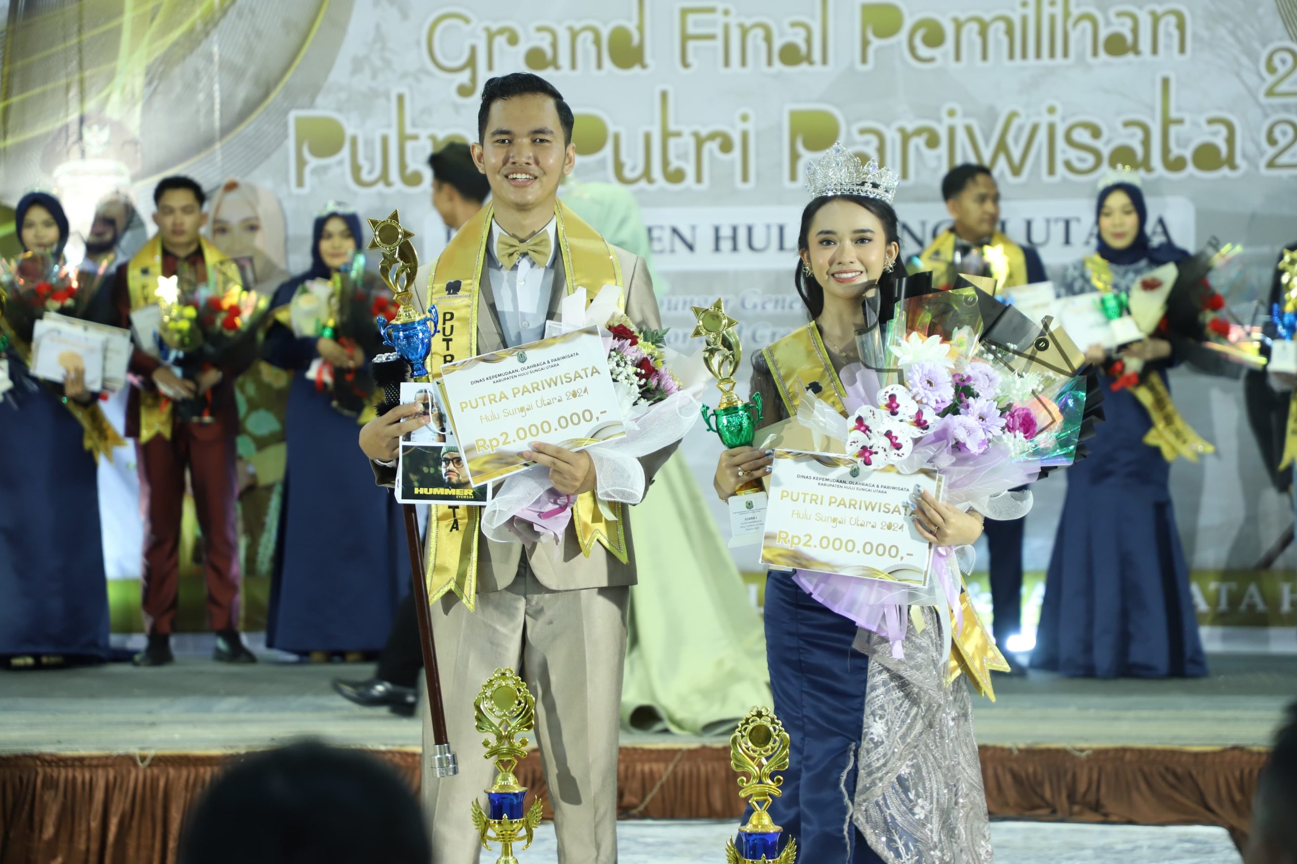 Keduanya terpilih ungguli 20 orang peserta dari 10 putra dan 10 putri pada malam Grand Final Pemilihan Duta Pariwisata HSU yang diselenggarakan oleh Dinas Kepemudaan, Olahraga dan Pariwisata (Disporaper) HSU di gedung Aneka Guna, Sabtu (17/02/2024) malam.