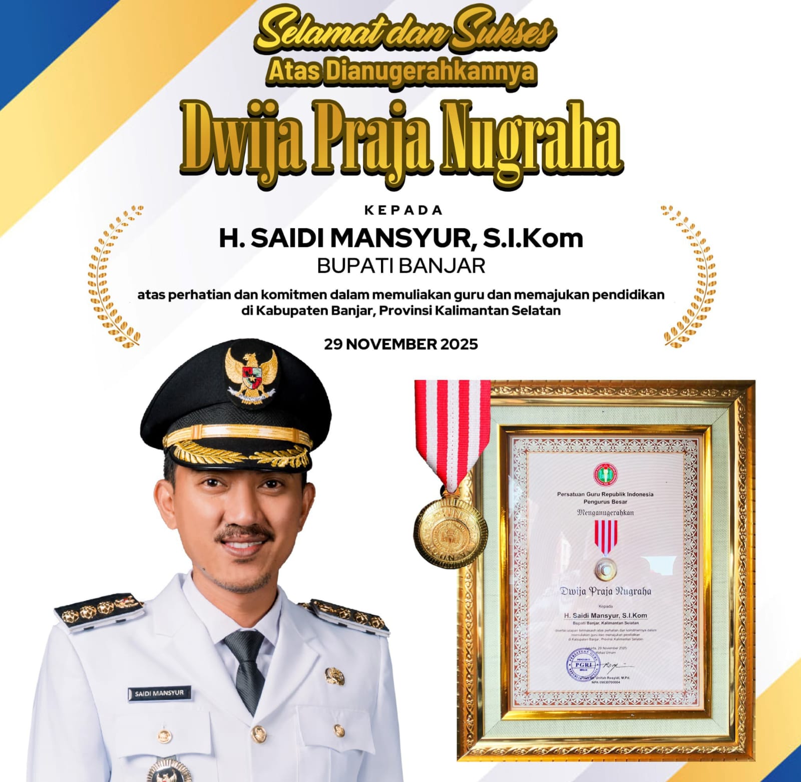 KANALKALIMANTAN.COM, JAKARTA – Bupati Banjar H Saidi Mansyur menerima Anugerah Dwija Praja Nugraha tahun 2025 dari Pengurus Besar Persatuan Guru Republik Indonesia (PB PGRI).