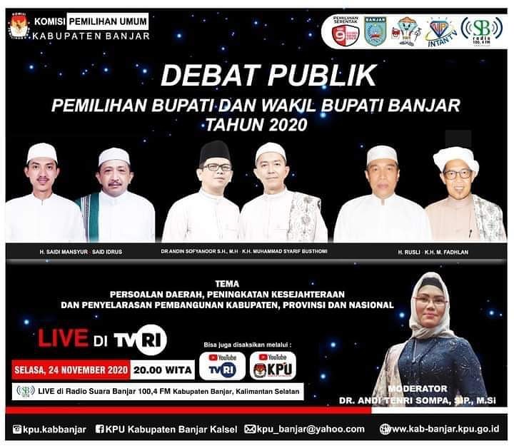 Malam ini, Selasa (24/11/2020) sesuai jadwal, debat publik Pilkada Kabupaten Banjar akan berlangsung mulai pukul 20.00 Wita yang disiarkan langsung dari Studio TVRI Kalimantan Selatan.
