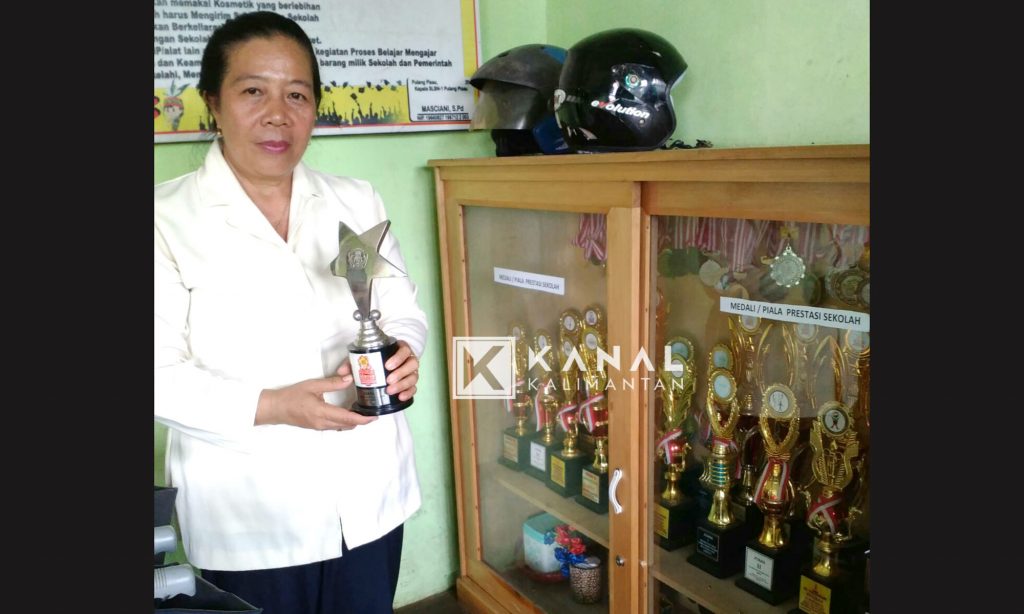 Misciani, Kepala Sekolah SLB 1 Pulpis saat menunjukan deretan piala yang berhasil diraih anak-anak SLBN 1 Pulpis. Foto : sanjaya