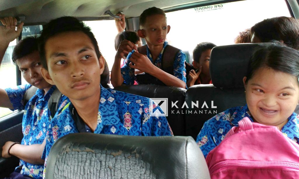 Sejumlah murid penyandang disabilitas terlihat berjejal di mobil angkutan saat akan diantar pulang sekolah. Foto : sanjaya