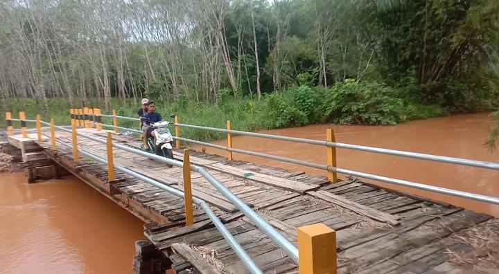 “Sedari dulu bentuk jembatannya seperti itu, sudah beberapa kali roboh sisinya itu tergerus air banjir,” ungkap warga setempat, Badaruddin kepada Kanalkalimantan.com