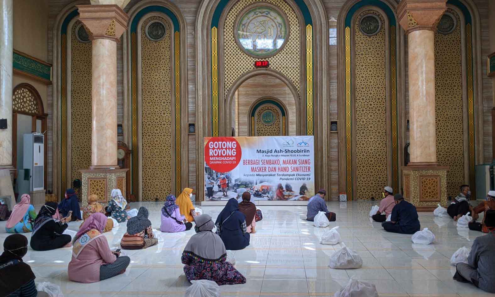 “Untuk hari ini, Selasa (21/4), kami membagikan 800 paket nasi kotak, 1.200 botol hand sanitizer, dan 150 paket sembako yang berisi 5 kilogram beras, 1 liter minyak goreng, beberapa bungkus mi instan dan sejumlah uang tunai untuk guru mengaji dan warga sekitar masjid yang mengalami pemutusan hubungan kerja, terang Molik di sela pembagian sembako di Masjid Ash-Shoobiriin.
