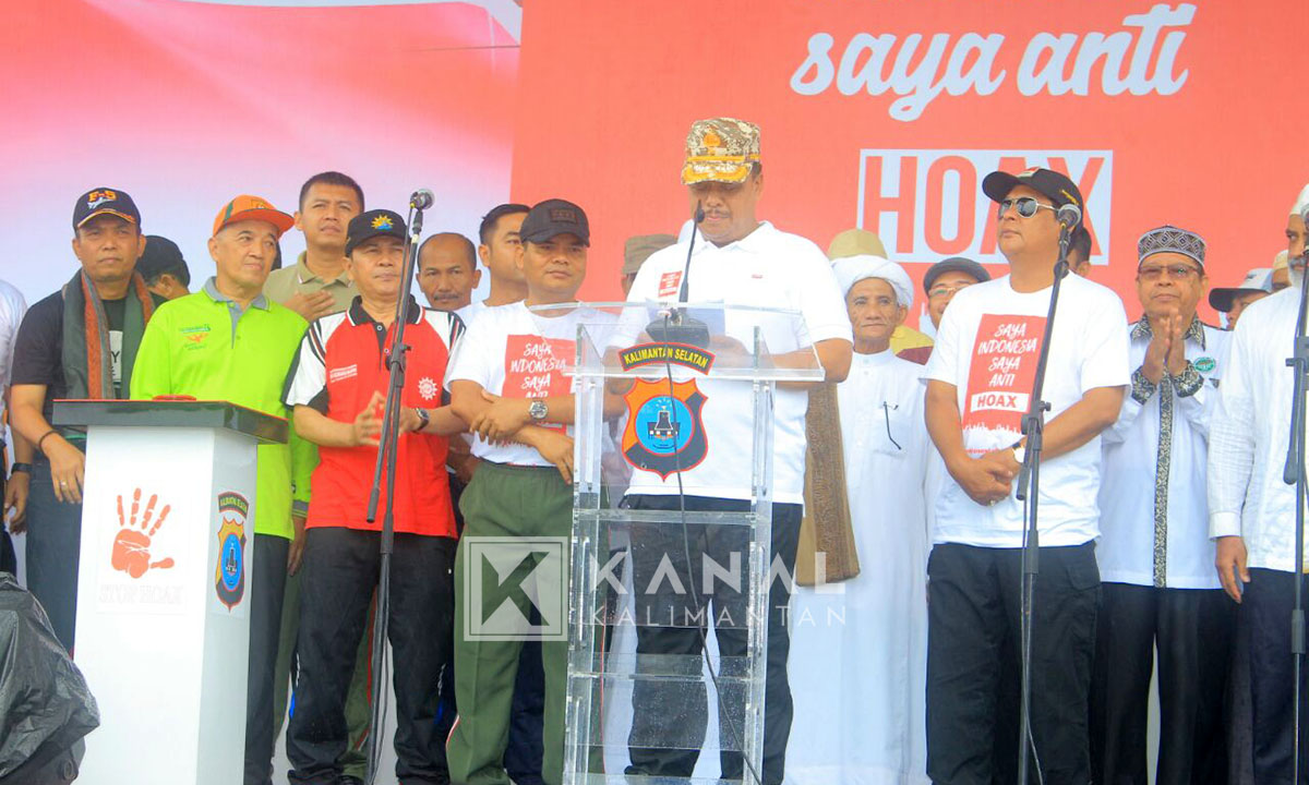 BANJARBARU, Masyarakat Kalsel menggalang gerakan anti hoax dan bertajuk ‘Kalimantan Selatan Anti Hoax, Bijak dan Cerdas dalam Bermedsos’ dalam acara yang digelar di Lapangan Mako Brimob Polda Kalsel, Banjarbaru, Jumat (16/3). Sementara itu, saat ini tujuh situs yang kerap tebar ujaran kebencian sedang dipantau Polda Kalsel.