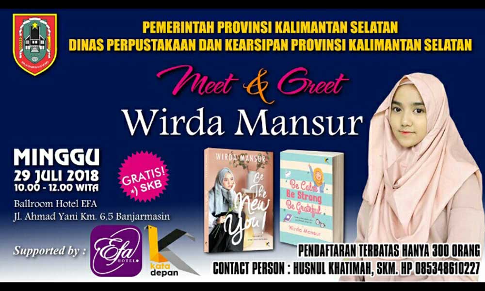 BANJARMASIN, Jelang Meet n Greet Wirda Mansur yang akan berlangsung di Eva Hotel pada Minggu (29/7), Dinas Perpustakaan Dan Kearsipan Provinsi Kalimantan Selatan akan menganjurkan untuk segera memiliki Kartu Tanda Anggota (KTA) Dispersip Kalsel agar bisa menjadi peserta Meet n Greet. Hal ini untuk tidak membludaknya para peserta datang, hanya 300 peserta saja yang bisa menghadiri kegiatan dari anak perempuan dari Ustadz Yusur Mansur itu.