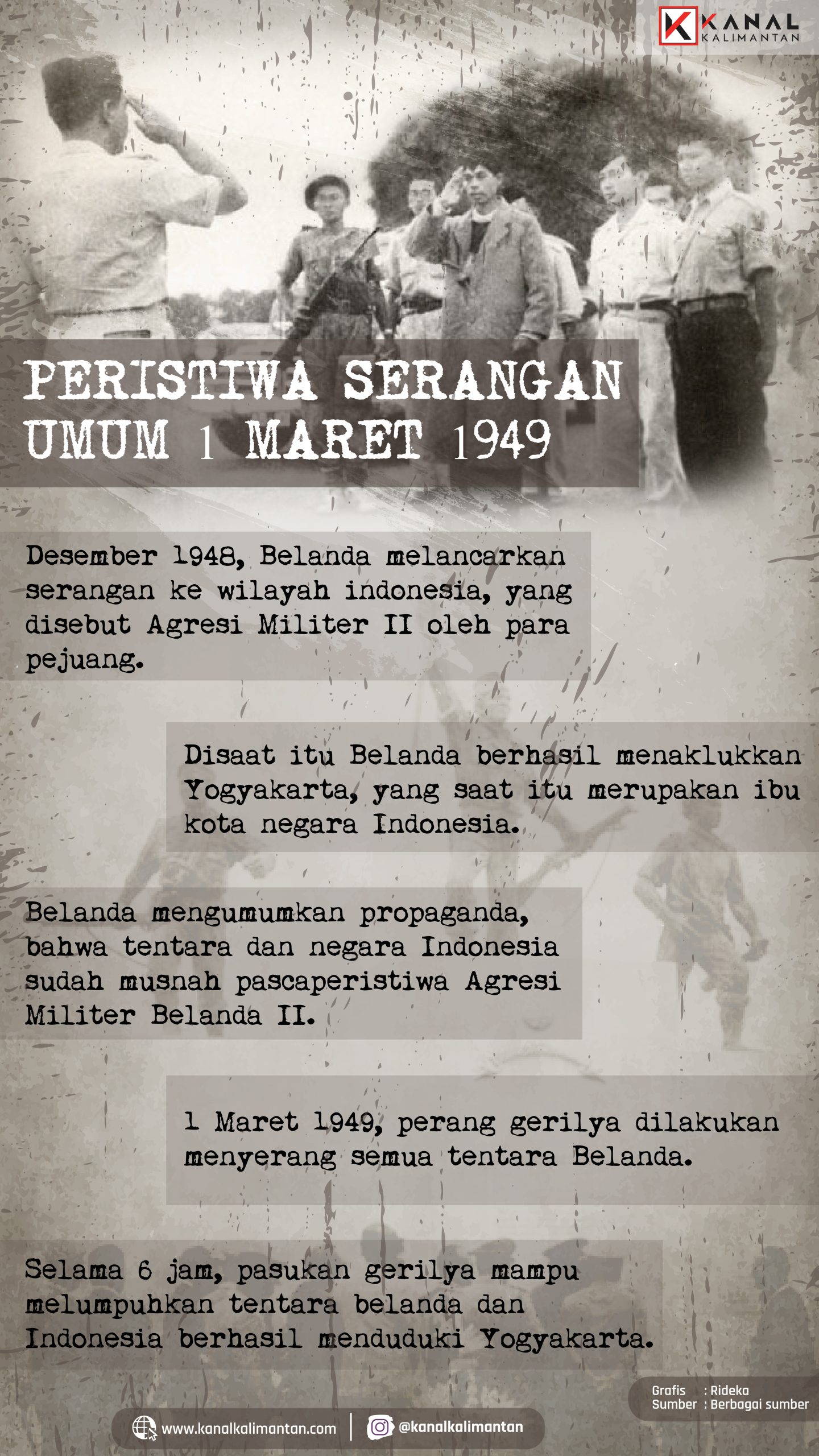 KANALKALIMANTAN.COM – Serangan Umum 1 Maret 1949 adalah serangan yang terjadi pada tanggal 1 Maret 1949 di Yogyakarta. Serangan ini telah dipersiapkan oleh jajaran tertinggi militer di wilayah Divisi III/GM III dengan mengikutsertakan pimpinan pemerintah sipil setempat berdasarkan instruksi dari Panglima Divisi III, Kol. Bambang Sugeng. Serangan ini bertujuan untuk membuktikan kepada dunia internasional bahwa Tentara Nasional Indonesia (TNI) masih ada dan cukup kuat, dengan harapan dapat memperkuat posisi Indonesia dalam perundingan yang sedang berlangsung di Dewan Keamanan PBB.
