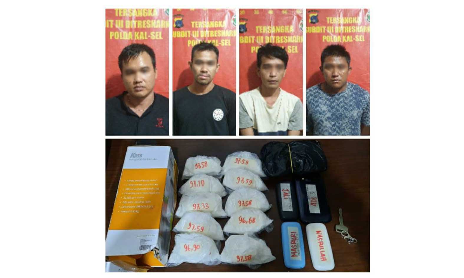 Adapun barang bukti yang disita oleh aparat Dit Resnarkoba Polda Kalsel yaitu 10 paket sabu berat kotor 973,52 gram (berat bersih 953,52 gram), satu buah kotak merk Kris warna putih kuning, satu lembar pastik warna hitam, empat handphone berbagai merk yang dimiliki oleh keempat tersangka, dan satu unit mobil Toyota Avanza.