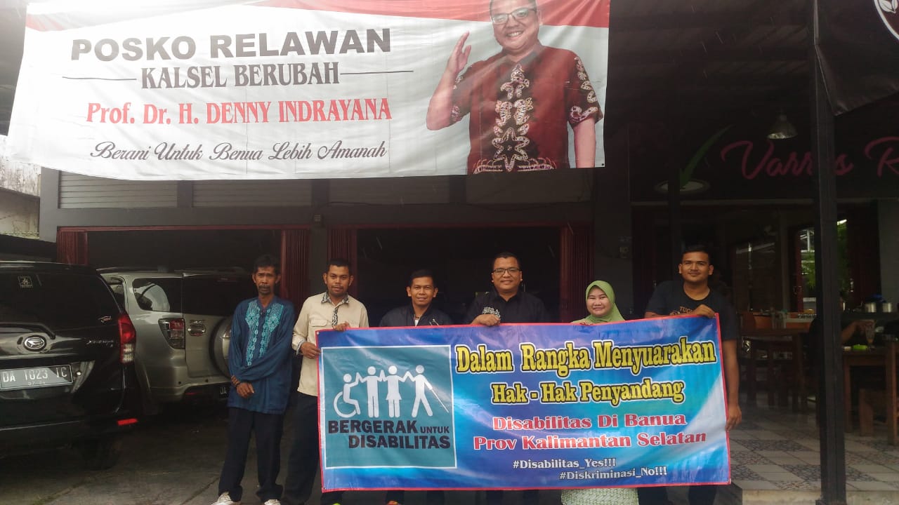 BANJARBARU, Sejumlah pengurus dari relawan Bergerak untuk Disabilitas, mendatangi posko relawan Kalsel Berubah di Jl A Yani Km 37 Banjarbaru, bertemu kandidat gubernur Denny Indrayana. Mereka memberi masukan serta curhat berbagai masalah terkait perhatian pada disabilitas Kalsel yang masih minim.