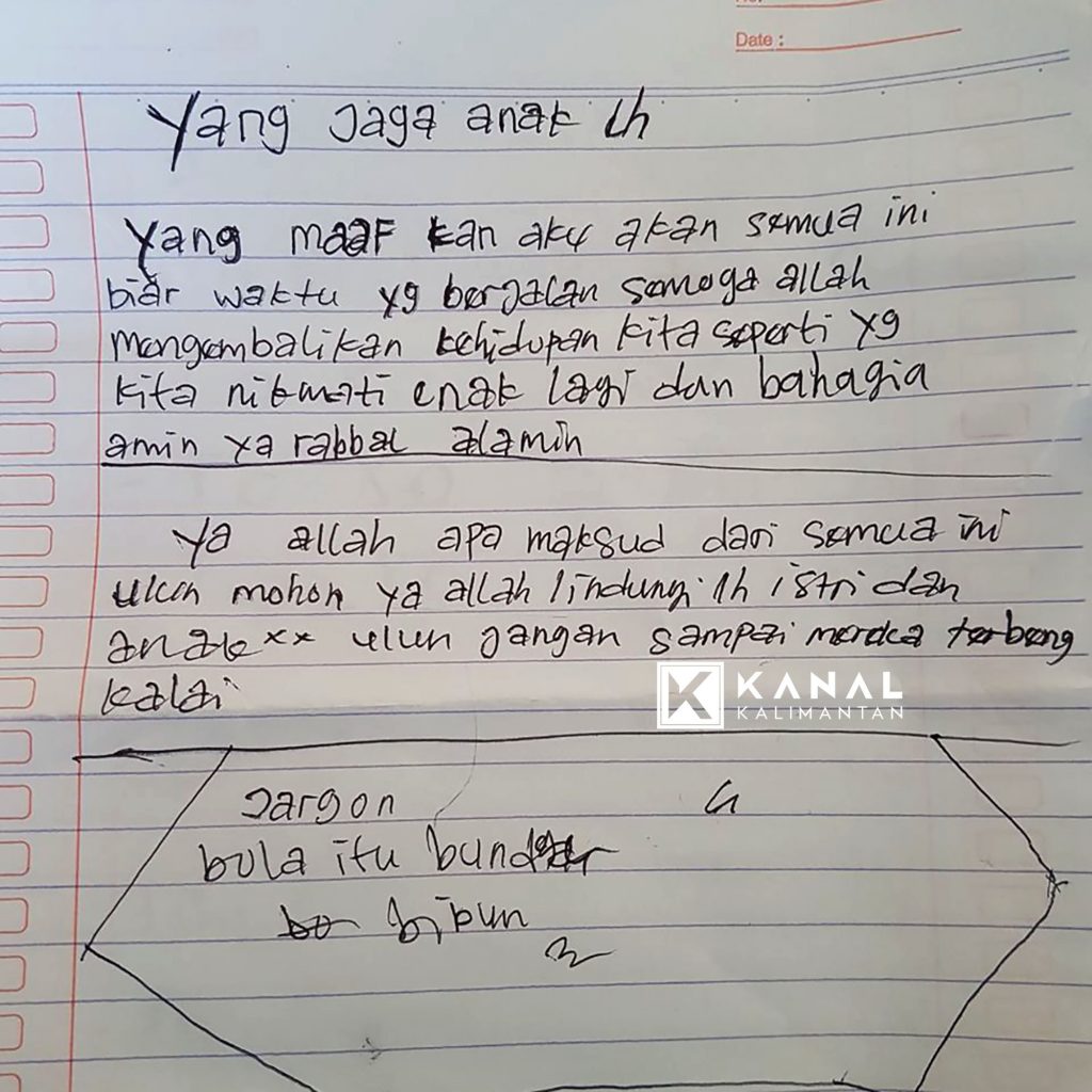 “Yang jaga anak lah. Yang, maafkan aku akan semua ini. Biar waktu yang berjalan. Semoga Allah mengembalikan kehidupan kita seperti yang kita nikmati enak lagi dan bahagia. Amin ya rabbal Alamin,”