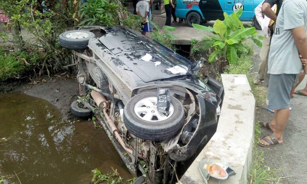 Di tengah jalan, mobil yang dikendarai menghindari anak sekolah yang sedang mengendarai sepeda BMX. Namun mobil malag terperosok masuk parit hingga terbalik. Informasi yang didapat untuk anak sekolah tersebut telah dibawa ke RS AURI Landasan Ulin.