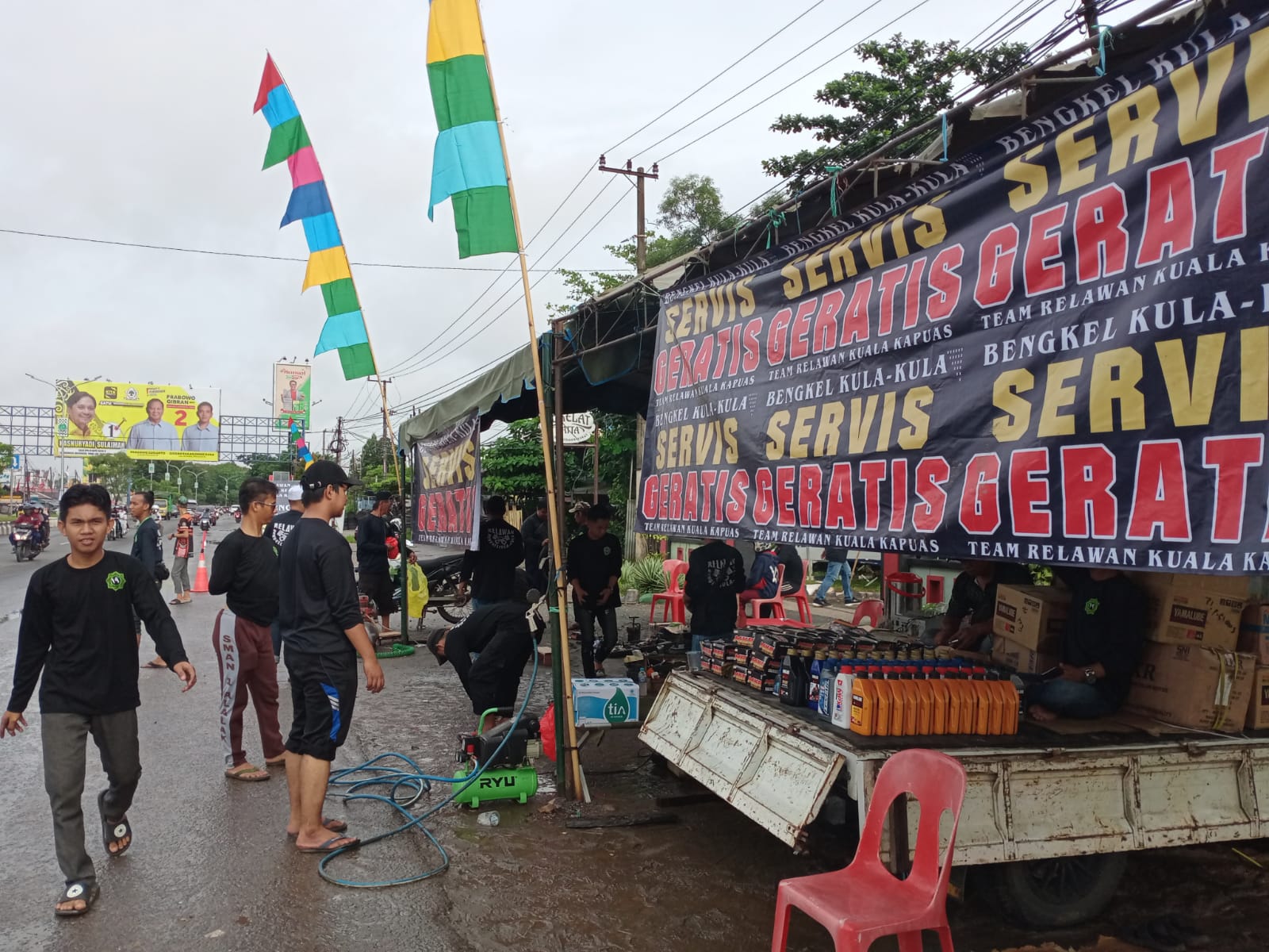 Berbeda dari posko lainnya yang kebanyakan menyediakan makan dan tempat istirahat gratis, relawan asal Kapuas ini menyediakan jasa servis kendaraan gratis.