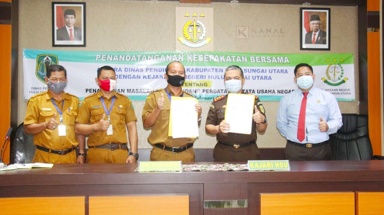 Kerjasama kesepakatan bersama penanganan masalah hukum bidang perdata dan tata usaha negara ini, ditandatangi Plt Kepala Disdik HSU H Junaidi Gunawan dengan Kepala Kejari HSU Novan Hadian, Selasa (9/2/2021) di aula kantor Kejari HSU.