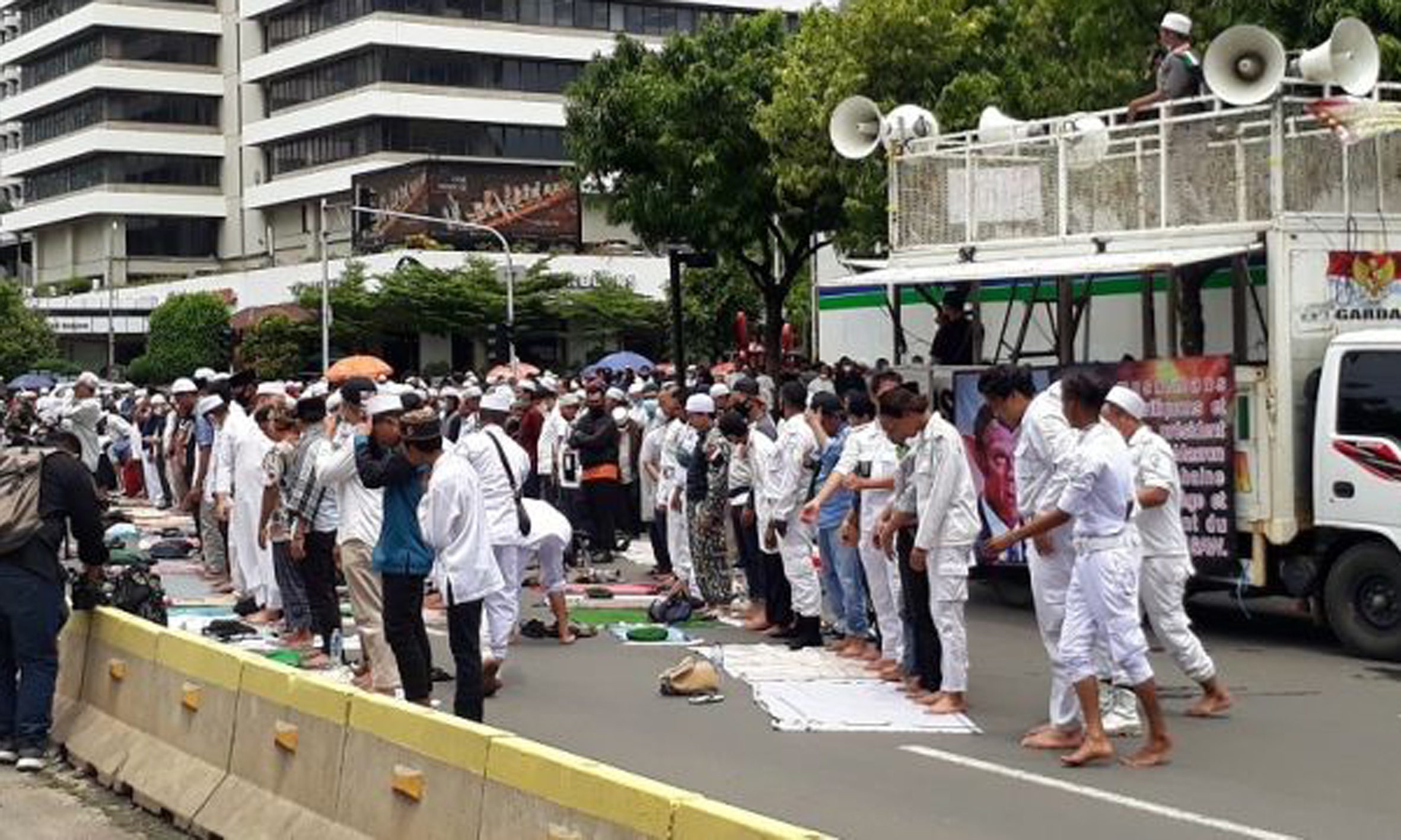 Sementara itu, massa sedang bersiap-siap untuk menggelar salat zuhur berjamaahsuara di lokasi. Adapun untuk arus lalu lintas, Jalan MH Thamrin dari mulai dari Simpang Sarinah mengarah ke Bundaran HI sudah ditutup total.
