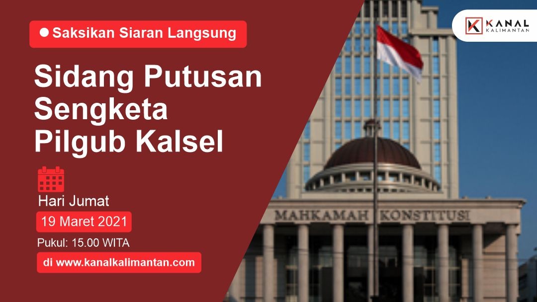 KANALKALIMANTAN.COM, BANJARBARU – Jumat (19/3/2021) sore ini, Mahkamah Konstitusi (MK) akan menggelar putusan sidang sengketa Pilgub Kalsel 2020.