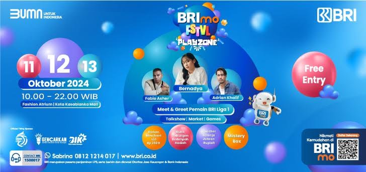 BRImo FSTVL Playzone kali ini menghadirkan berbagai aktivitas menarik mulai dari penampilan musik dari berbagai musisi ternama yakni, Bernadya, Fabio Asher, dan Adrian Khalif, hingga kesempatan mengikuti meet & greet dengan pemain BRI Liga 1 pada 12 Oktober 2024 pukul 16.00 – 16.30 WIB. Ikuti juga keseruan workshop make up dan chunky bag serta talkshow bertema “Investasi & Transaksi Cerdas pakai BRImo” bersama Direktur Retail Funding and Distribution BRI Andrijanto, Entrepreneur Raymond Chin, dan Pemain BRI Liga 1 Ryuji Utomo.