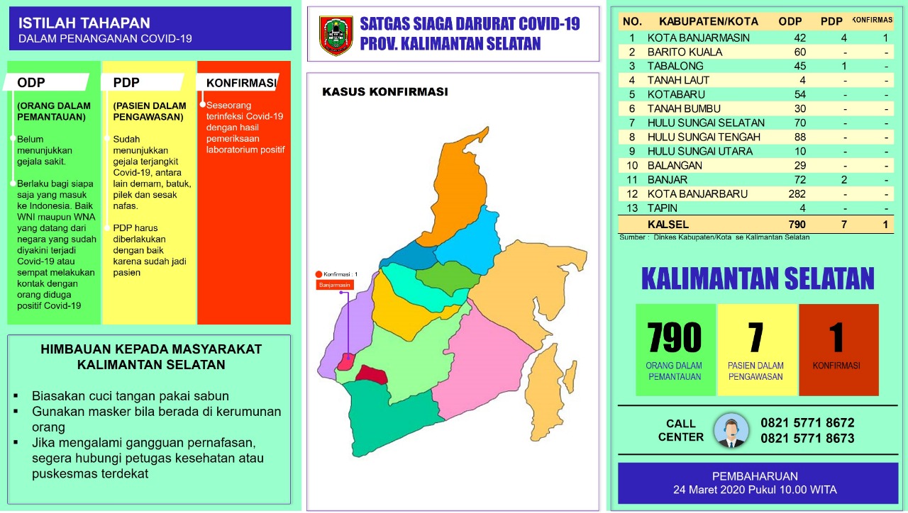 KANALKALIMANTAN.COM, BANJARMASIN – Dalam kurun waktu satu hari saja, jumlah orang dalam pemantauan (ODP) di Kalimantan Selatan melonjak drastis. Data terbaru pada Selasa (24/3/2020) pagi pukul 10:00 Wita, jumlah ODP di Kalsel mencapai 790 orang. Kota Banjarbaru masih menduduki peringkat pertama jumlah ODP terbanyak, yaitu 282 orang.