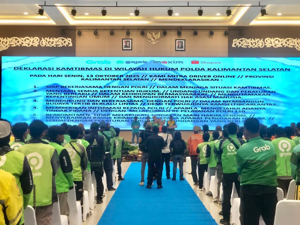 KANALKALIMANTAN.COM, BANJARBARU – Sebanyak 500 orang ojek online (Ojol) di Kalimantan Selatan (Kalsel) berkumpul mendeklarasikan diri untuk menjaga keamanan dan ketertiban masyarakat (Kamtibmas) di gedung auditorium Kepolisian Daerah (Polda) Kalsel, Senin (13/10/2025).