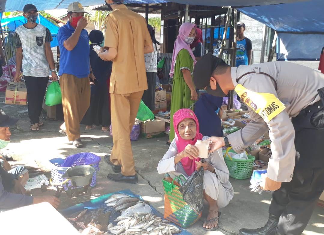 Penyampaian imbauan pencegahan penyebaran Covid-19 di pasar mingguan Kelurahan Palingkau Lama. Foto: ags