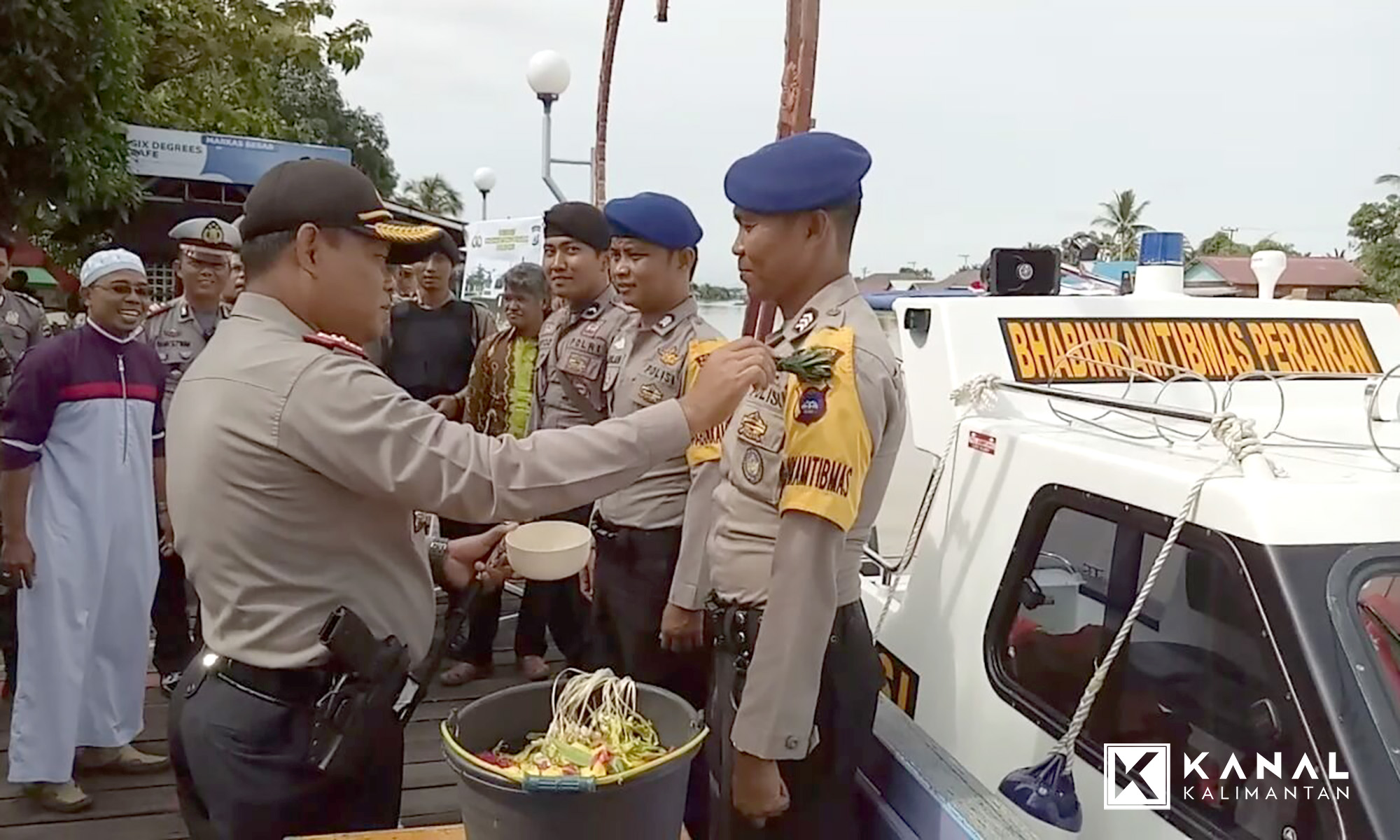 Usai apel, Kapolres HSU AKBP Agus Sudaryatno menggelar selamatan dan penyerahan speed boat dari Polri kepada anggota Bhabinkamtibmas perairan Polres HSU di Dermaga Siring Itik Amuntai. (dewahyudi)