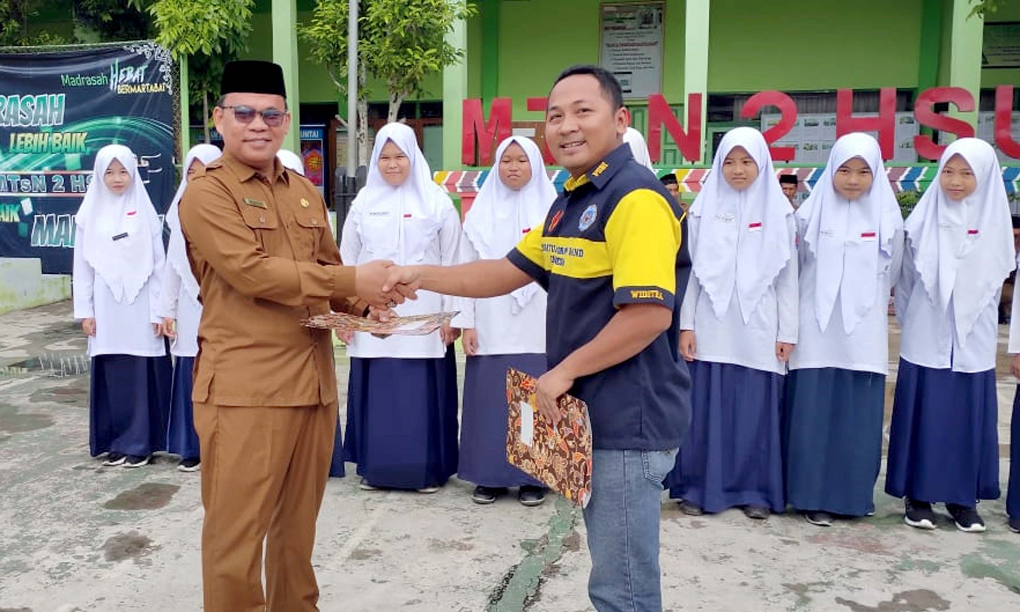 Apresiasi ditunjukkan PDBI HSU kepada MTsN 2 HSU, piagam penghargaan diberikan Sekretaris PDBI HSU, saat pelaksanaan apel bendera di halaman sekolah, Senin (6/1).
