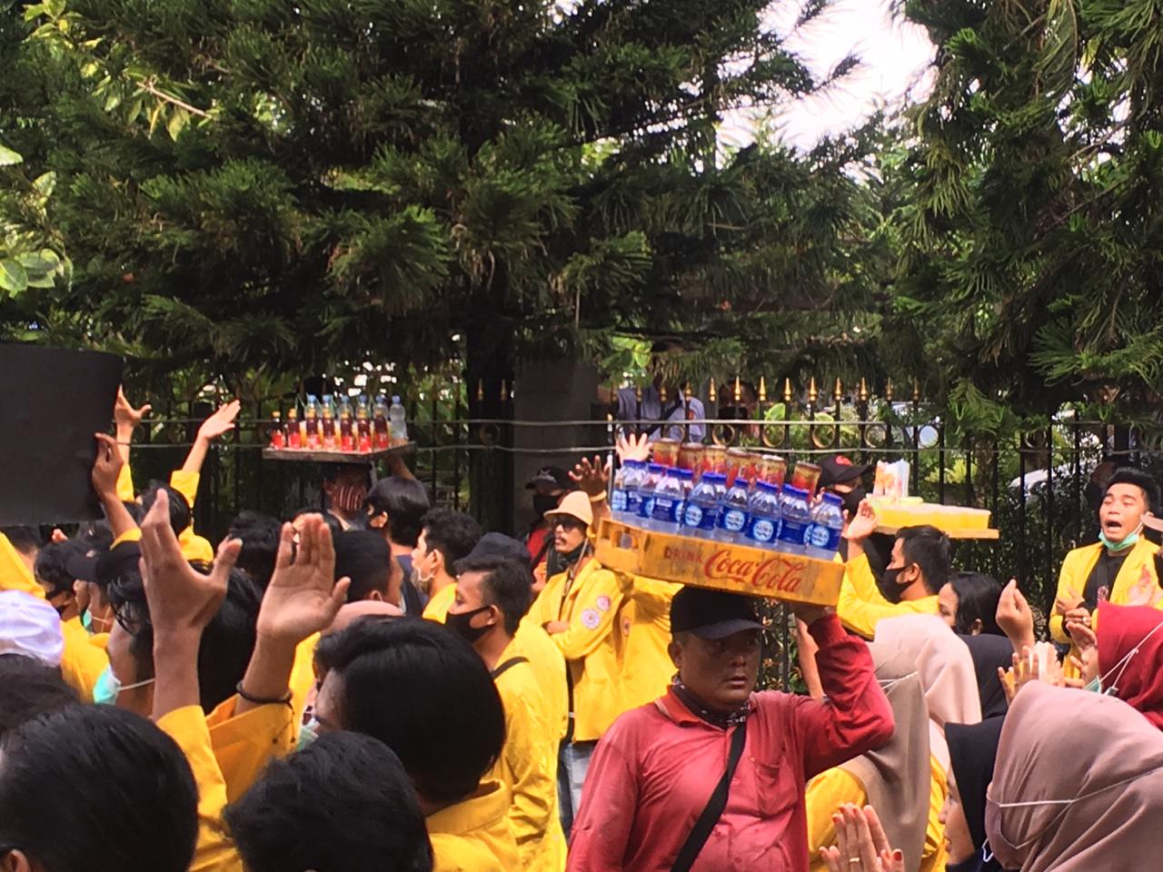KANALKALIMANTAN.COM, BANJARMASIN – Demonstrasi penolakan UU Omnibus Law Cipta Kerja mahasiswa Kalsel, membawa rezeki bagi pedagang asongan, Kamis (15/10/2020). Belasan pedagang asongan air mineral dingin dan camilan menjajakan jualannya pada demonstran yang bertahan hingga saat ini di depan DPRD Kalsel.