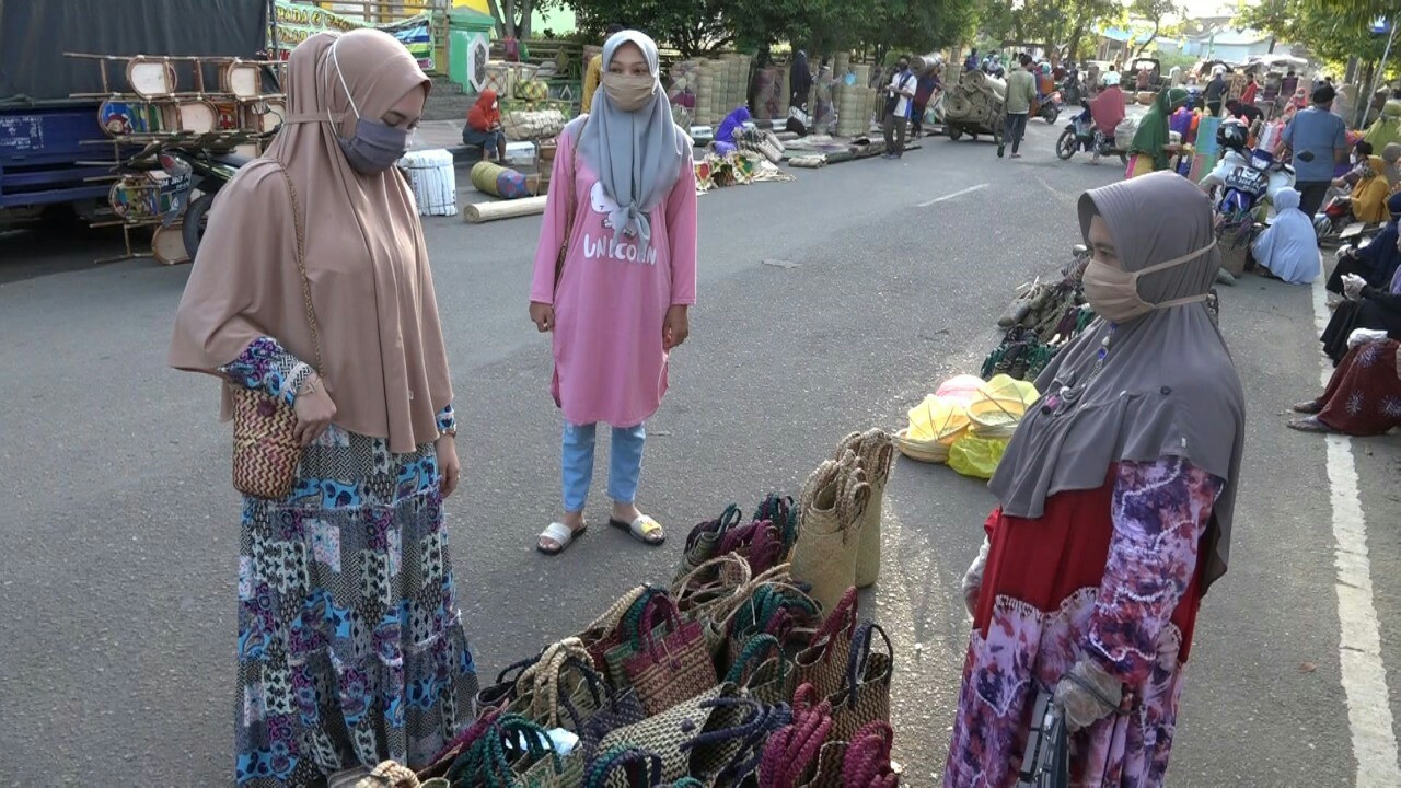 “Kami selalu menjaga agar nantinya kami terhindar dari virus corona,” kata pedagang yang mengaku puluhan tahun berjualan tas berbahan dasar tanaman purun ini.