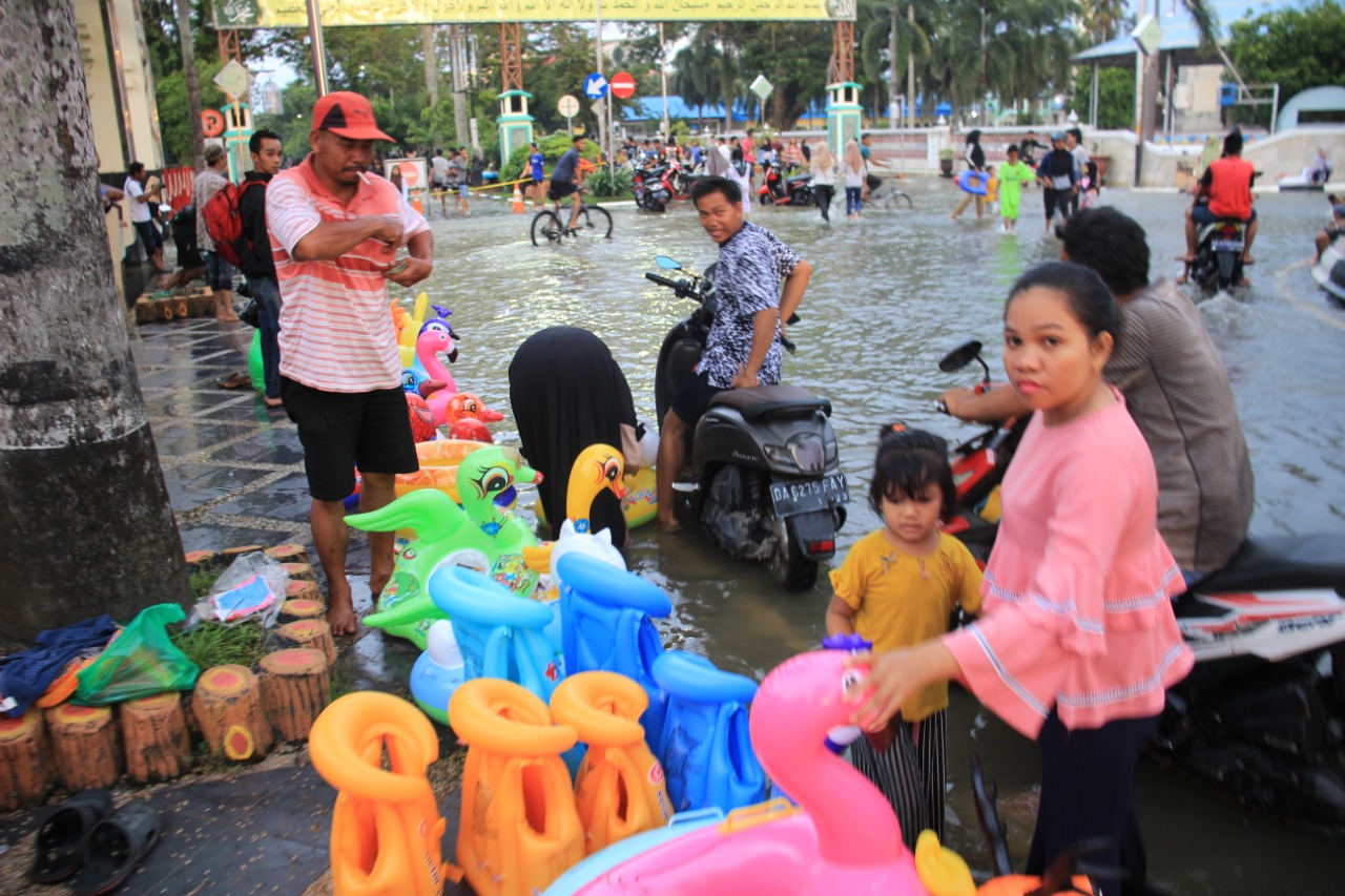 Seperti salah seorang pedagang pelampung mainan, Sudarmono. Ia mengaku tuai banyak rezeki ketika banjir melanda kota Amuntai. Khususnya ketika air sampai meluap dan membanjiri ruas jalan protokol kota, secara otomatis bakal dimanfaatkan anak-anak untuk bermain.