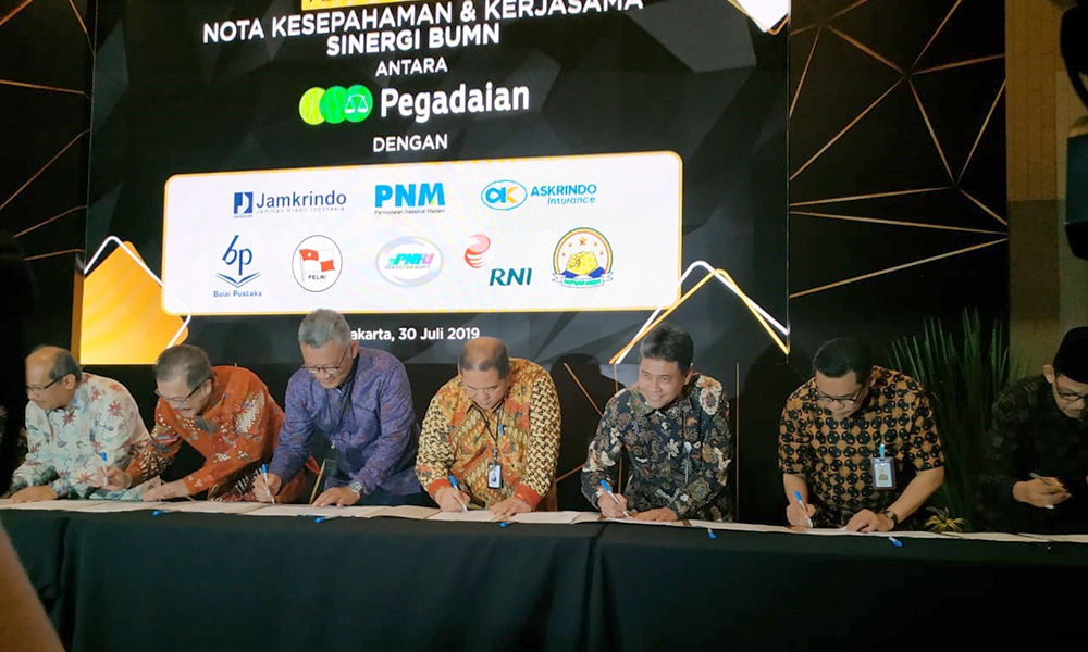 Sebelumnya, Pegadaian sudah menandatangani perjanjian kerja sama dengan PT ASDP Indonesia Ferry (Persero), sebagai bentuk sinergi bisnis antar perusahaan Badan Usaha Milik Negara (BUMN). Kerja sama tersebut merupakan bentuk nyata kolaborasi antar BUMN penjualan produk. Pada Juni 2019, Pegadaian juga menjalin kerja sama dengan tiga BUMN lain yaitu PT Garuda Indonesia (Persero), PT Perkebunan Nusantara lll (PTPN lll), dan PT Tabungan dan Asuransi Pensiunan (Persero) Taspen. Sehingga tercatat hingga saat ini Pegadaian sudah menjalin kerja sama dengan 10 perusahaan BUMN.
