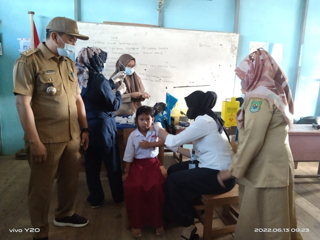 Pemberian vakasin dilakukan tim pelaksanaan imunisasi anak di SDN 2 Selat Utara didampingi para guru saat proses imunisasi berlangsung.